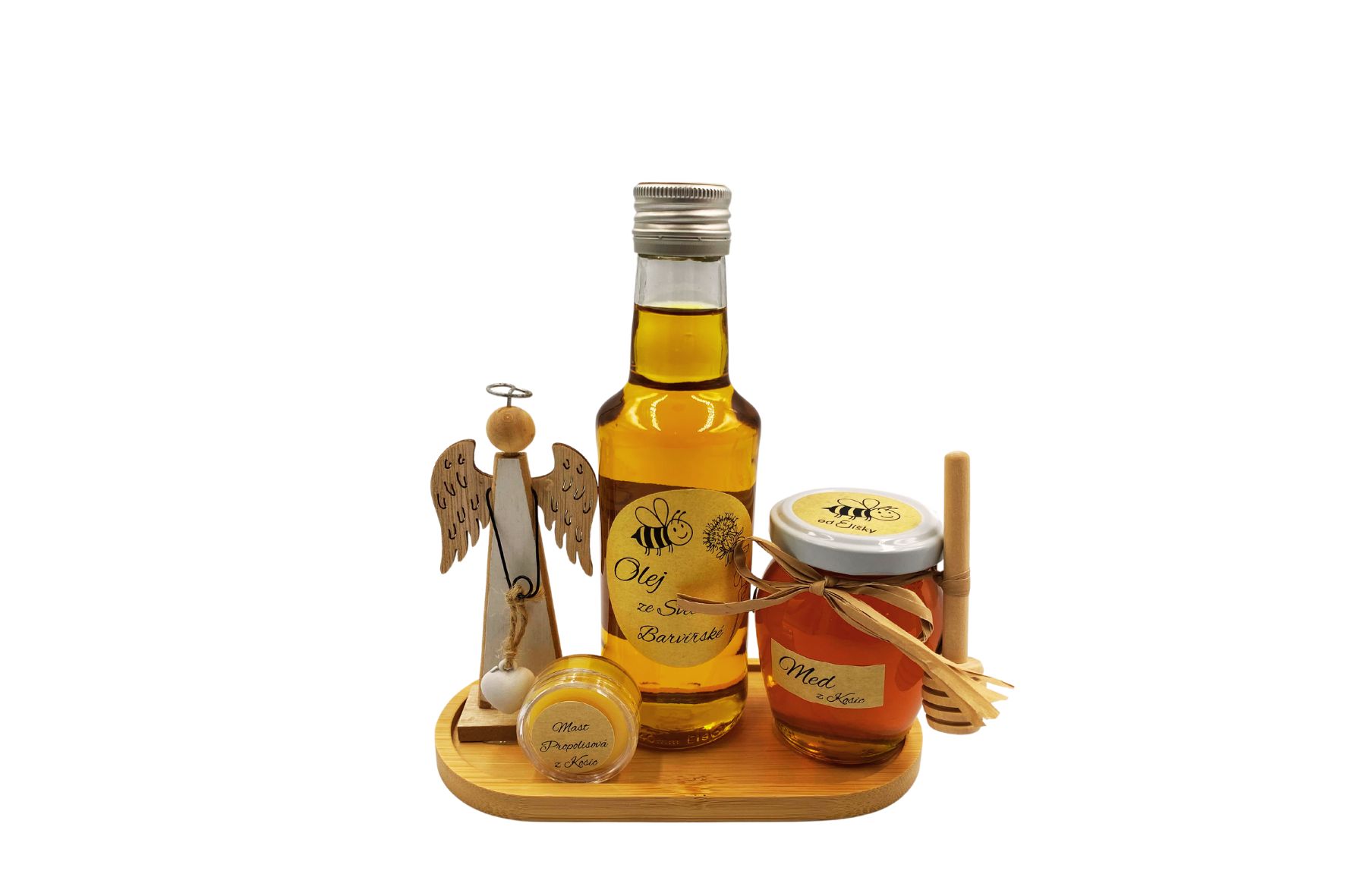 Olej ze světlice barvířské 200ml, med 190g+nabírátko, propolisová mast 10ml,dřevěný dekorační anděl 12 cm, dřevěný tácek 16,5x8 cm. Součástí ceny je celofánový sáček, mašle z pytloviny a dárková papírová taška. K dárkovým balíčkům doporučujeme dokoupit dřevěný výřez s přáním z kategorie dekorace.