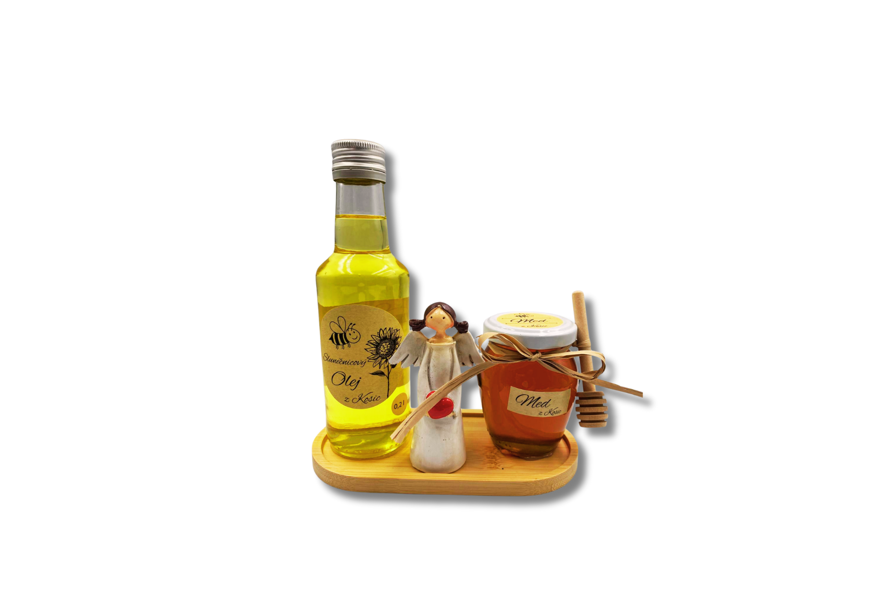 Olej slunečnicový 200ml, med 190g + nabírátko, dřevěný dekorační anděl 9,5 cm, dřevěný tácek 16,5x8 cm. Součástí ceny je celofánový sáček, mašle z pytloviny a dárková papírová taška. K dárkovým balíčkům doporučujeme dokoupit dřevěný výřez s přáním z kategorie dekorace.