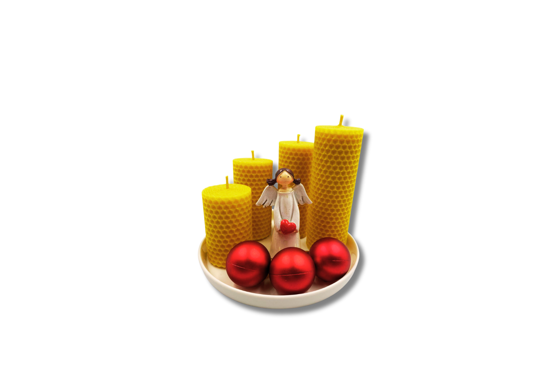Svíčka z mezistěny 7,9,11,13 cm, dekorační anděl 9,5cm, vánoční ozdobičky, porcelánový tácek 16 cm.