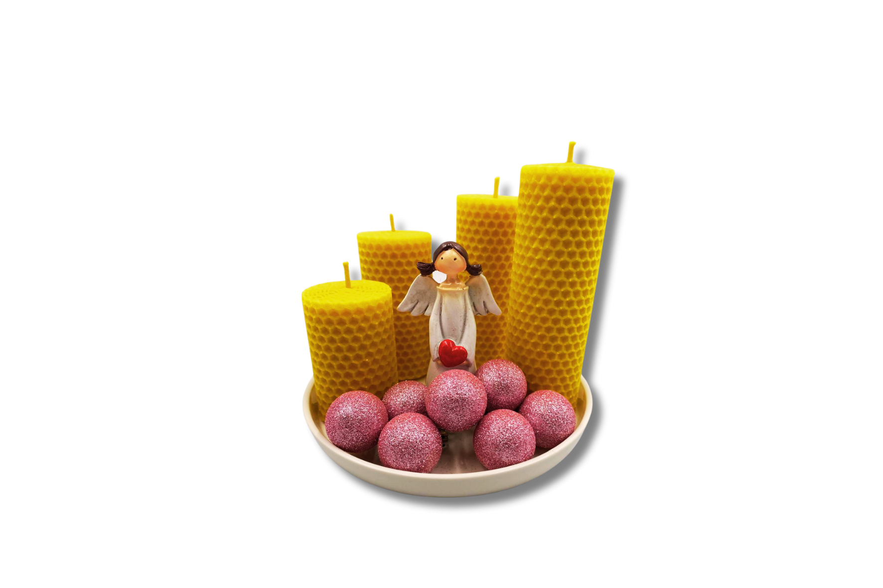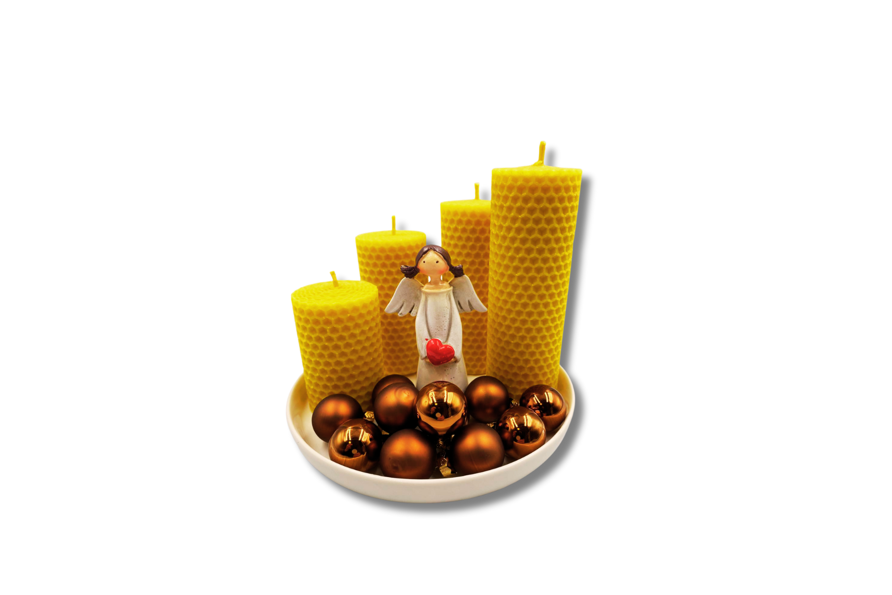 Svíčka z mezistěny 7,9,11,13 cm, dekorační anděl 9,5cm, vánoční ozdobičky, porcelánový tácek 16 cm.