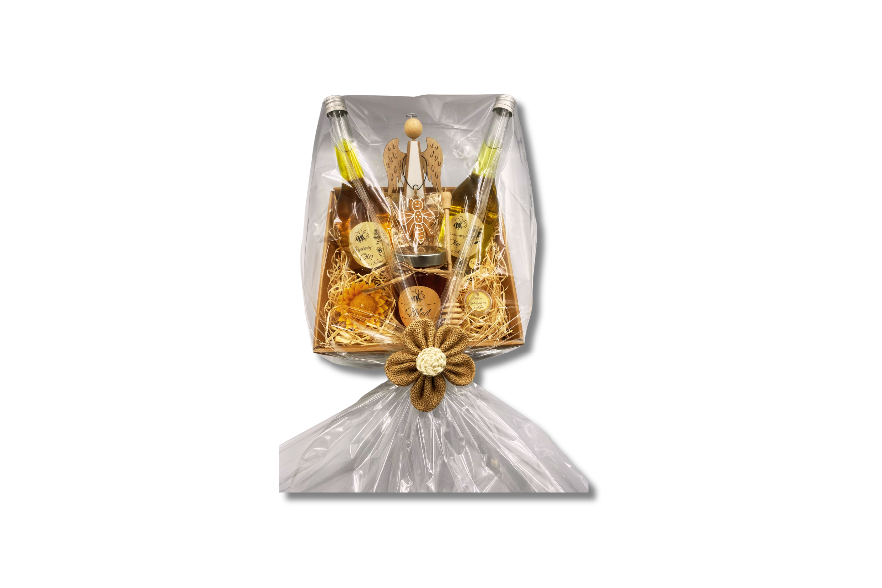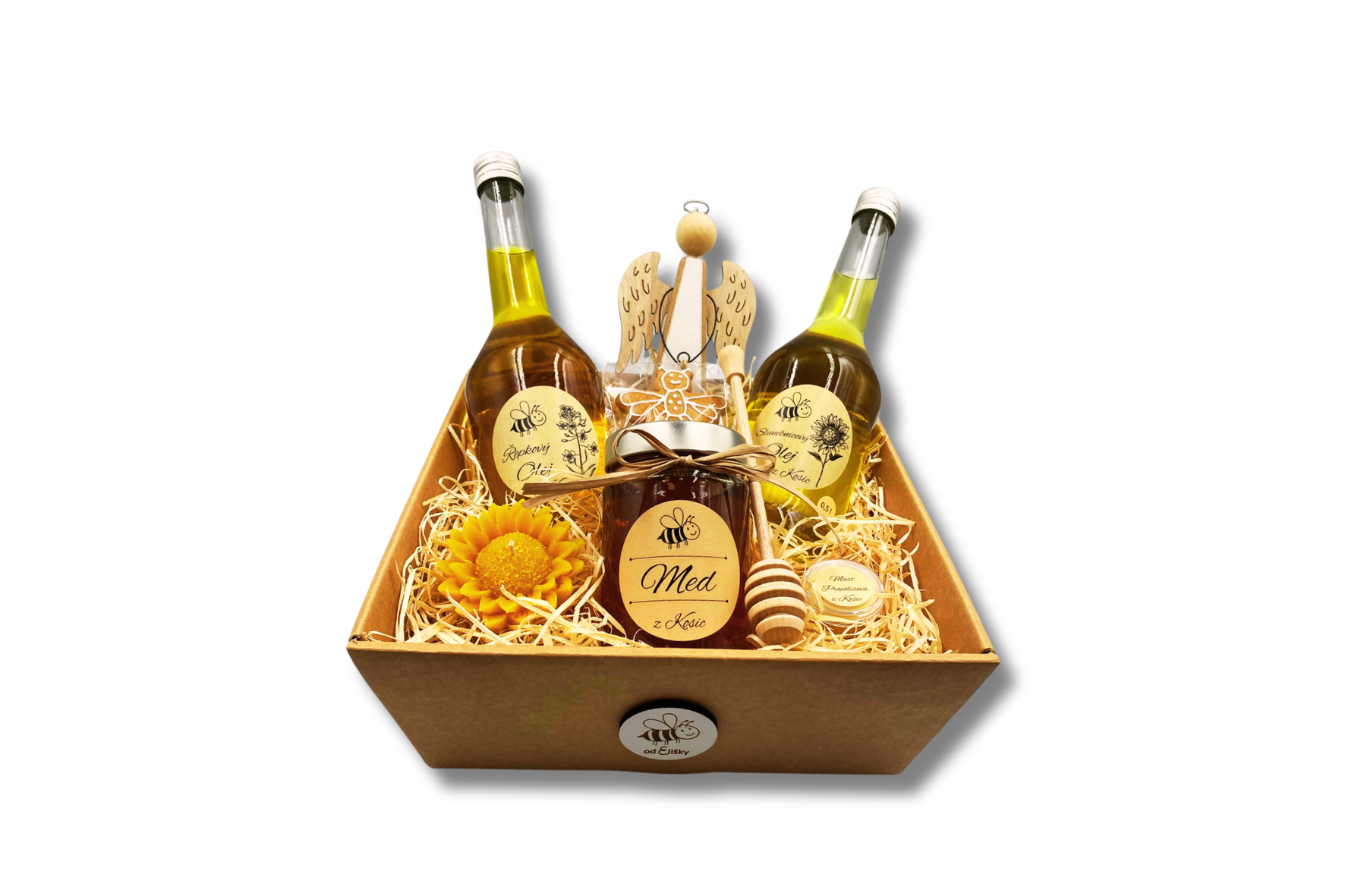 olej slunečnicový 0,5l, olej řepkový 0,5l, med 400g, nabírátko na med, svíčka slunečnice, propolisová mast 10 ml, dřevěný dekorační anděl 19 cm, medový perníček včelka.