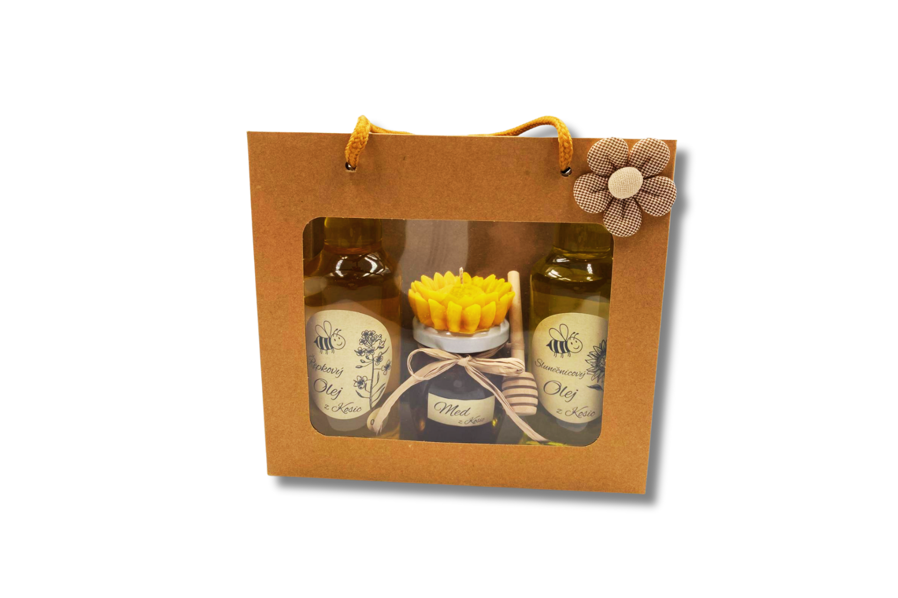 Taška 20x18 cm s průhledným okénkem, olej slunečnicový 200 ml, olej řepkový 200 ml, med 190g + nabírátko, svíčka slunečnice z včelího vosku 6 cm. K dárkovým balíčkům doporučujeme dokoupit dřevěný výřez s přáním z kategorie dekorace.