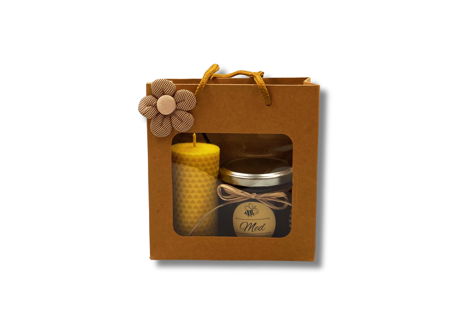 Taška 14x15 cm s průhledným okénkem, med 200g + nabírátko, svíčka z mezistěny 9 cm.