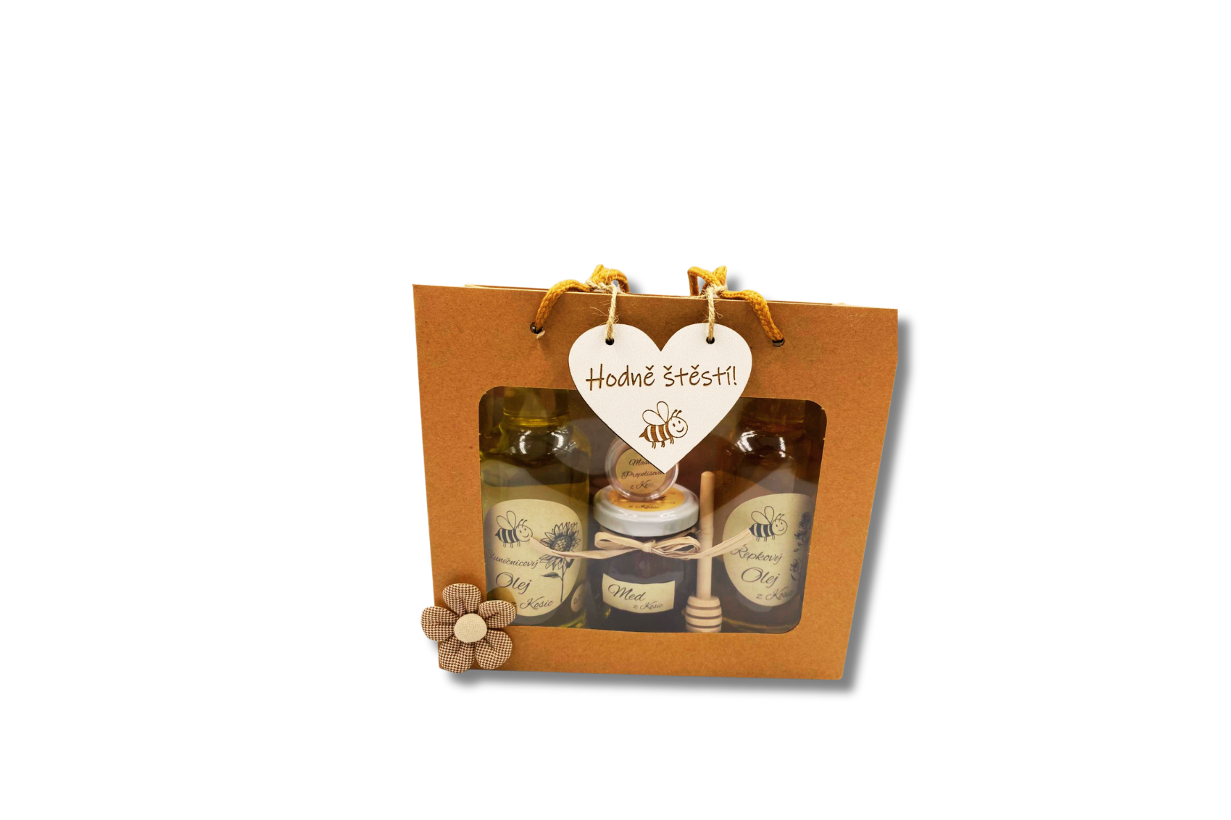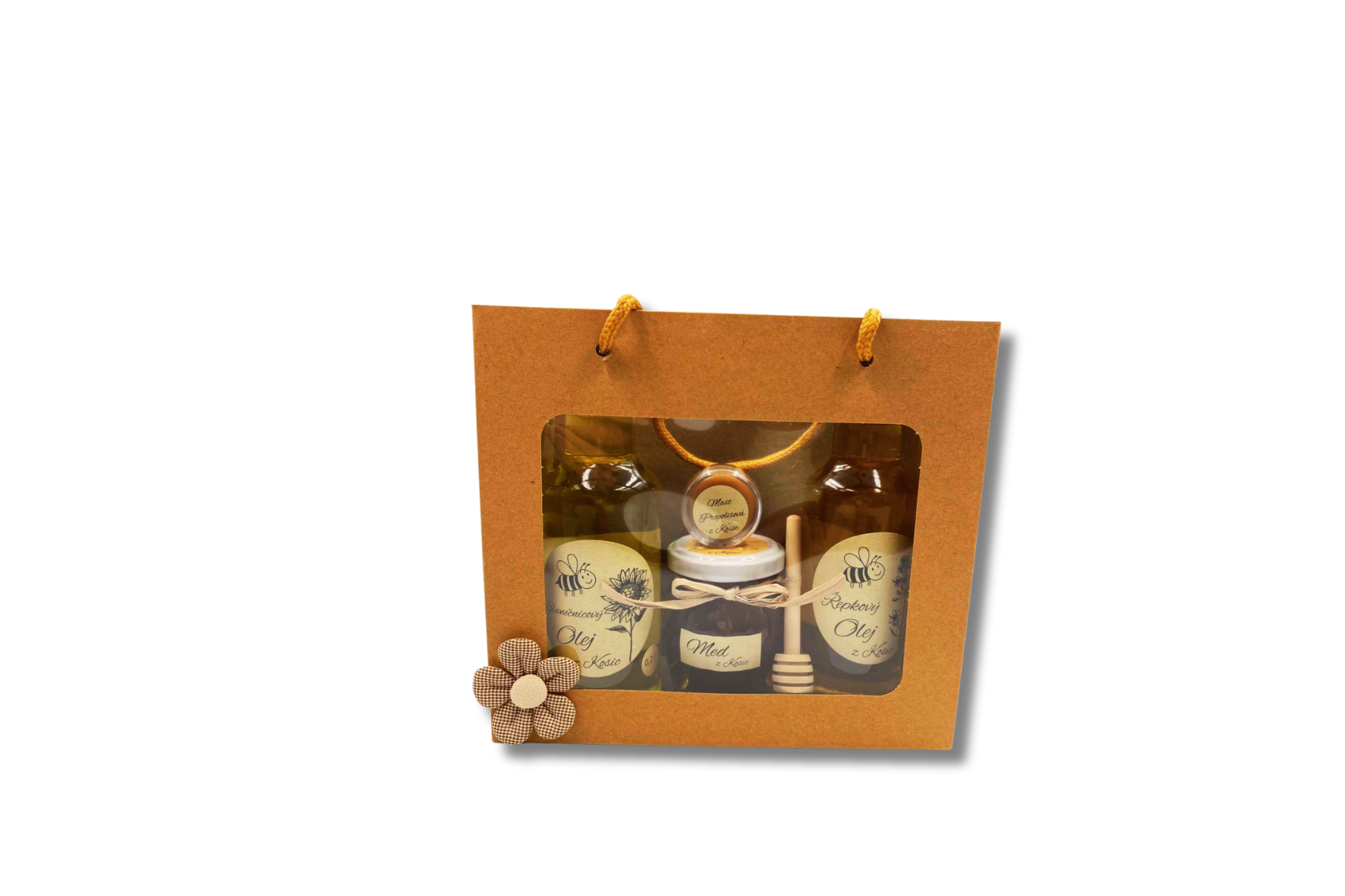 Taška 20x18 cm s průhledným okénkem, olej slunečnicový 200 ml, olej řepkový 200 ml, med 190g + nabírátko, propolisová mast 10 ml. K dárkovým balíčkům doporučujeme dokoupit dřevěný výřez s přáním z kategorie dekorace .
