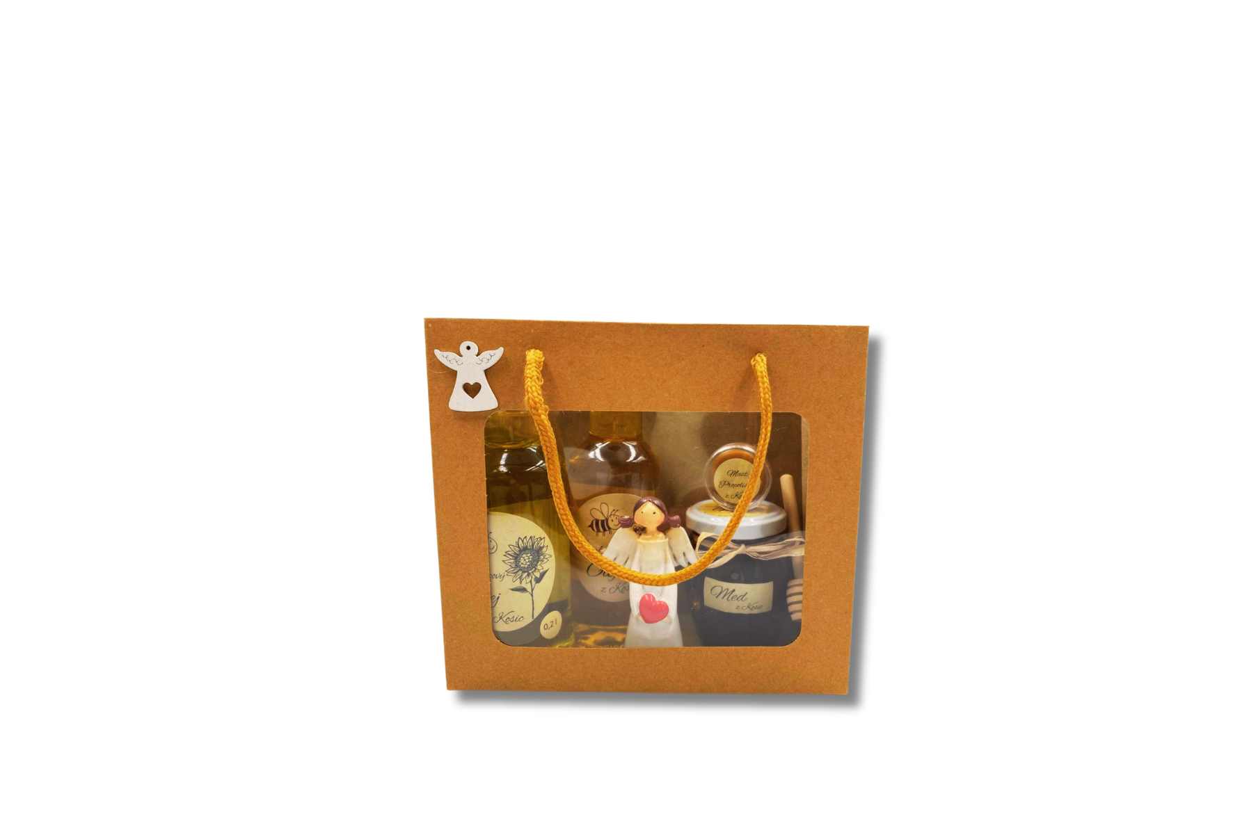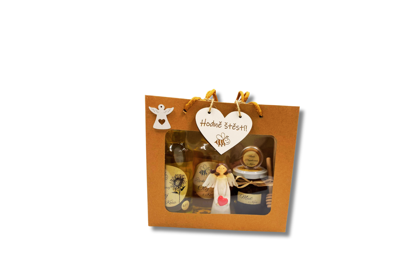 Taška 20x18 cm s průhledným okénkem, olej slunečnicový 200 ml, olej řepkový 200 ml, med 190g + nabírátko, propolisová mast 10 ml, dekorační anděl 9,5 cm. K dárkovým balíčkům doporučujeme dokoupit dřevěný výřez s přáním z kategorie dekorace .